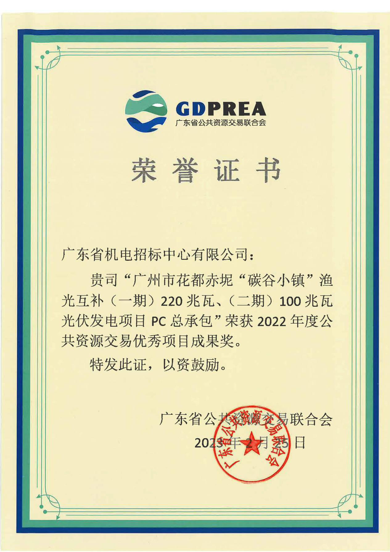 2022 年度公共资源交易优秀项目成果奖”56 个。我中心申报项目“广州市花都赤坭“碳谷小镇”渔光互补(一期)220兆瓦、(二期)100兆瓦光伏发电项目PC总承包”和“肇庆学院高性能储存器建设(一期)采购项目等竞价项目一批”荣获2022年度公共资源交易优秀项目成果奖。本次获奖,是公共资源交易行业对我中心招标代理工作的认可,我中心将不负众望,继续为社会各界提供高效优质的招标采购服务工作。