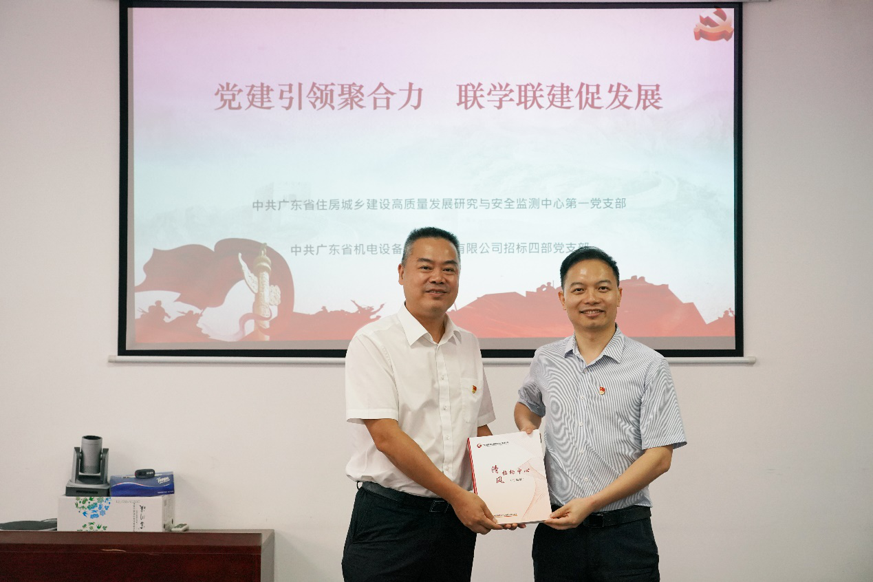 住房城乡建设高质量发展研究与安全监测中心(以下简称发展与安全中心)第一党支部开展“党建引领聚合力 联学联建促发展”为主题的党建共建活动。招标中心党总支书记、执行董事、总经理邹吉炎接待了来访人员。发展与安全中心党总支书记黄守新以及双方有关人员参加了本次活动。