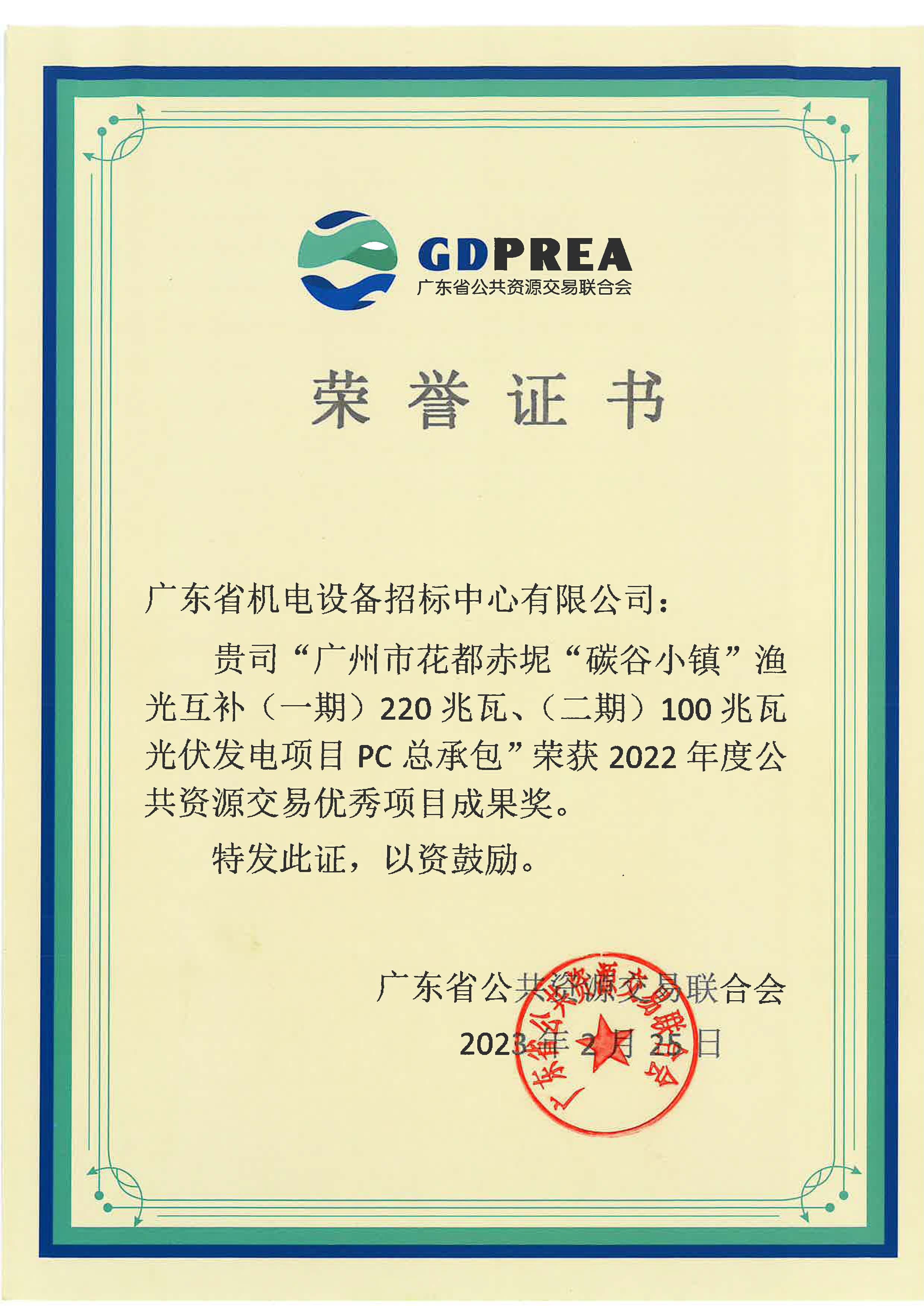 2022 年度公共资源交易优秀项目成果奖--“广州市花都赤妮“碳谷小镇”渔光互补 (一期) 220 兆瓦、(二期) 100 兆瓦光伏发电项目 PC 总承包”项目