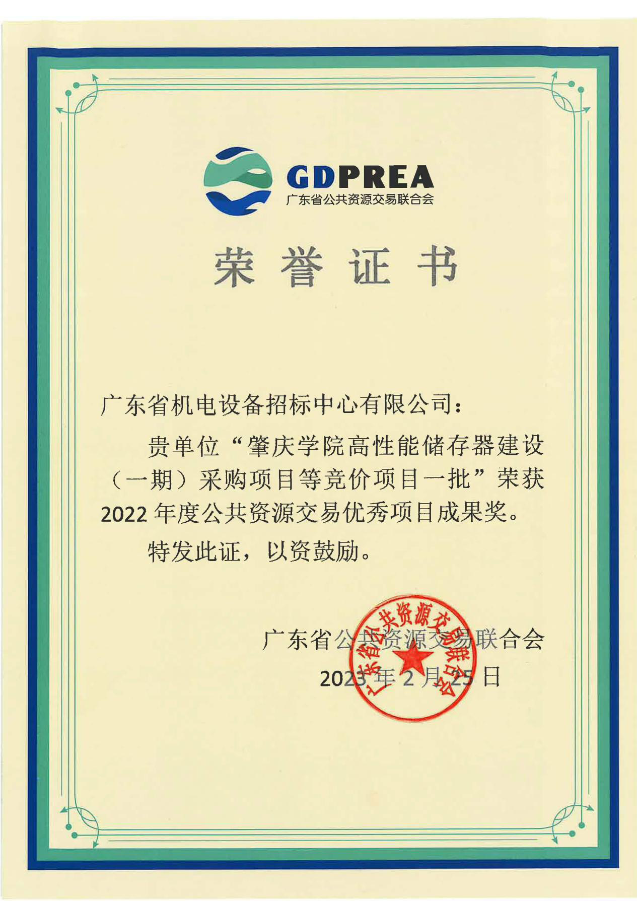 2022 年度公共资源交易优秀项目成果奖”56 个。我中心申报项目“广州市花都赤坭“碳谷小镇”渔光互补(一期)220兆瓦、(二期)100兆瓦光伏发电项目PC总承包”和“肇庆学院高性能储存器建设(一期)采购项目等竞价项目一批”荣获2022年度公共资源交易优秀项目成果奖。本次获奖,是公共资源交易行业对我中心招标代理工作的认可,我中心将不负众望,继续为社会各界提供高效优质的招标采购服务工作。