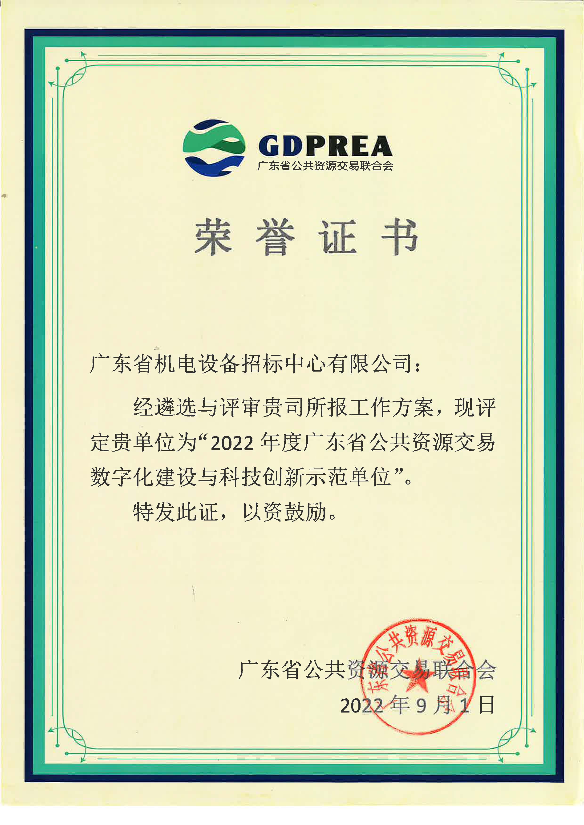 2022年度爱游戏ayx·(中国)官方网站-AYX.COM 公共资源交易数字化建设与科技创新示范单位荣誉证书